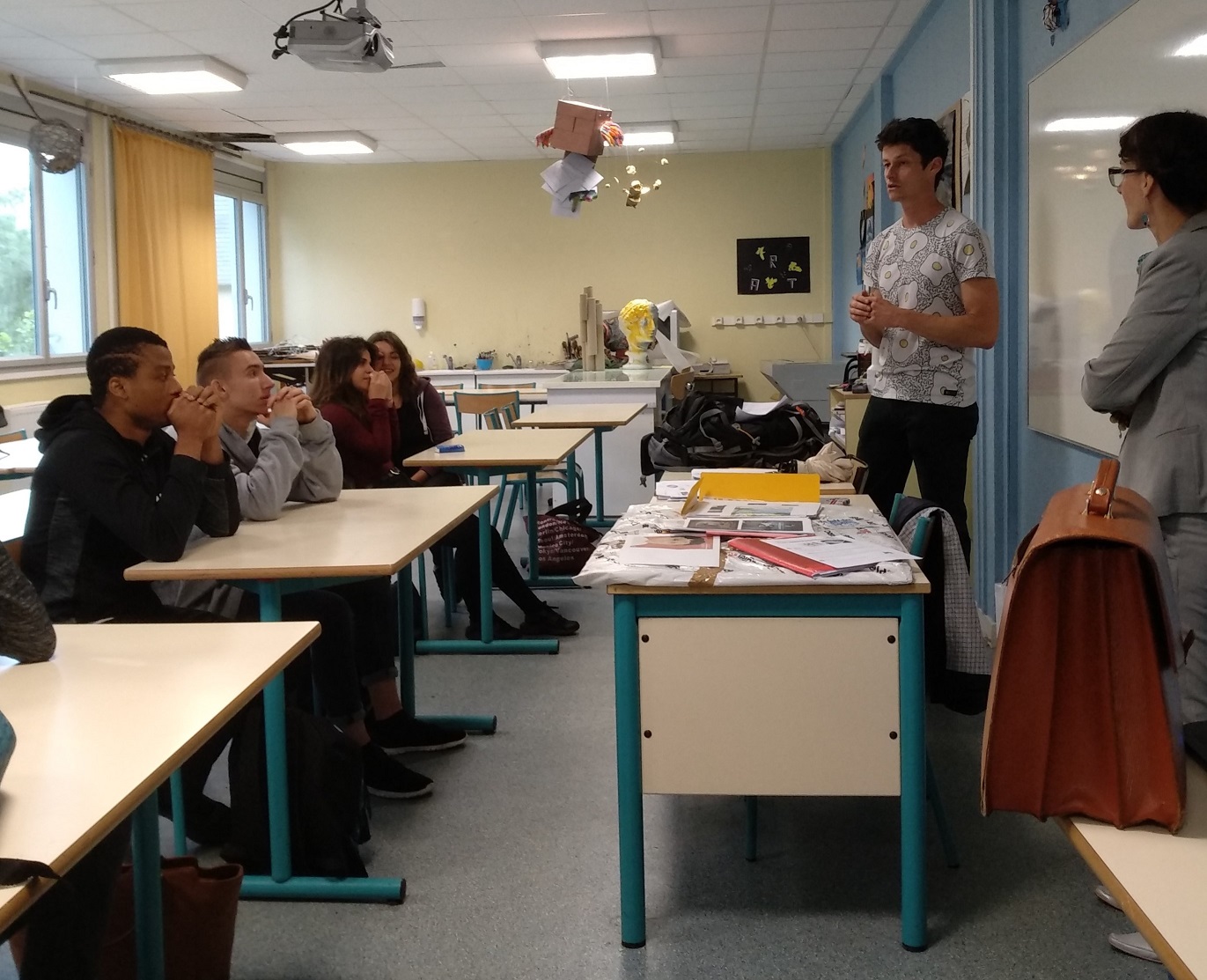 Un projet artistique et culturel a été mis en place du lundi 11 juin au vendredi 15 juin 2018 jusqu’à 16h. Chaque jour de la semaine, se déroulaient des activités encadrées par des enseignants et un artiste designer venu spécialement de Paris pour cette occasion. Lundi 11 juin, la rencontre avec l’artiste en résidence au Lycée, le designer graphiste Vincent Croguennec, qui a présenté le travail du designer, ses actions, ses réalisations, notamment lors de la résidence au Musée de l’imprimerie d’Ussel. Dans l’après-midi, il a été prévu de visiter la Grange,l’ exposition « Les Luddites », et le parcours dans la ville pour visionner les vitrines mises en valeur par les affiches de l’artiste.
